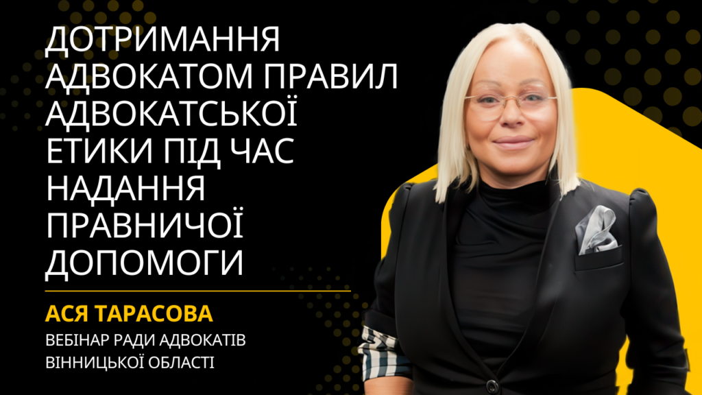 Лектор: Тарасова Ася Миколаївна – член Вищої кваліфікаційно-дисциплінарної комісії адвокатури, член комітету з питань адвокатської етики НААУ, адвокат